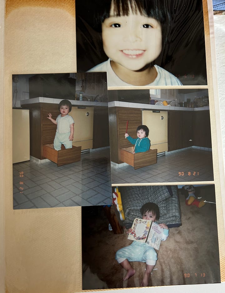 But I think there’s something sweet about it, too, and I relish my hunger for the details. I can’t wait for Theo to know that his great grandfather used to hide coins on the bed linens so when he and my mom went to change the sheets, they’d go flying in the air to surprise her. Or that when I was little, my mom put me on a strict no-preservatives diet in concern of my eczema and there’s a picture of me chomping away, standing smugly over a Little Caesar’s rectangle pizza that was bigger than me.